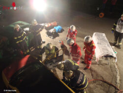 Sofort wurde mit dem Aufbau des Brandschutzes sowie der Beleuchtung begonnen. Der Übungsleiter der Feuerwehr beriet in der Zwischenzeit mit dem Übungsleiter des Roten Kreuzes Bad Ischl bzw. mit der anwesenden Notärztin bzgl. der Vorgehensweiße bei der Personenbergung.