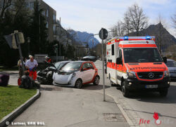 BAD REICHENHALL (BAYERN): Am Donnerstagmittag, 31. März 2016, gegen 12.20 Uhr ist bei einem Verkehrsunfall vor der Hotelfachschule eine 32-jährige Frau nach erster Einschätzung leicht verletzt worden. Eine 74-Jährige war mit ihrem Smart auf der Münchner Allee stadteinwärts unterwegs.