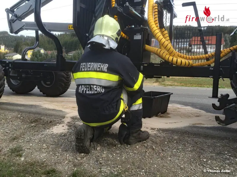 Binnen acht Stunden galt es vier hintereinander folgende Einsätze zu bewältigen. Begonnen hat die Einsatzserie in den Mittagsstunden mit einer Traktorbergung in Spielberg. Gegen 16:00 Uhr verlor ein Traktor samt Anhänger zwischen Knittelfeld und Apfelberg entlang der L 504 Öl. Auf rund vier Kilometer Länge mussten 30 Feuerwehrmänner aus Apfelberg und Knittelfeld die ausgetretenen Betriebsmittel per Hand binden und entsorgen.