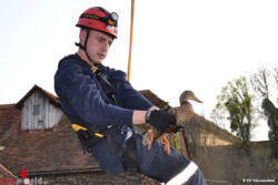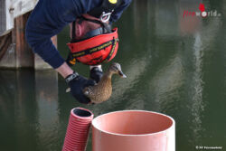 Das Tier kam durch eine Öffnung unter Wasser in ein rund 40 cm breites Polokalrohr, konnte sich aber aufgrund des Auftriebs nicht mehr eigenständig daraus retten. Bei Wartungs- und Kontrollarbeiten wurde die Ente in ihrer Notsituation entdeckt und die Feuerwehr alarmiert. Ein Kamerad seilte sich, gesichert am Kran, kopfüber zur Ente ab und rettete diese. Anschließend konnte das Tier ein Stück flussaufwärts wieder in die Freiheit entlassen werden.