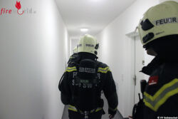 Die Wohnungseigentümer waren zu diesem Zeitpunkt kurz im Gangbereich vor der Wohnung. Da die Wohnungseigentümer gerade am Kochen waren stand ein Kochtopf am Herd. Kurze Zeit nach der Alarmierung konnte sich die im Haus anwesende Mannschaft mit einem Tanklöschfahrzeug auf den Weg zur Einsatzadresse machen. Bei der Ersterkundung wurde bereits im kompletten Gangbereich vor der Wohnung intensiver Rauch wahrgenommen.