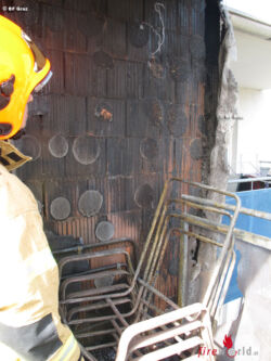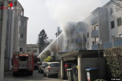 Diese konnten durch den Einsatz eines C-Rohres niedergeschlagen werden konnten. Somit wurde eine Brandausbreitung auf die Fassade verhindert. Ein Atemschutztrupp verschaffte sich währenddessen Zugang über die Wohnungstüre und ging mit einem weiteren C-Rohr zur Menschenrettung und Brandbekämpfung vor. Rasch stellte sich heraus, dass sich keine Personen in der Wohnung aufhielten und der Brand sich auf den Bereich des Balkons beschränkte. Nur durch den schnellen Einsatz wurde die Ausbreitung in die Wohnung über ein gekipptes Fenster verhindert.