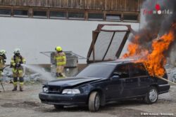 Dem nicht genug! Auch ein drittes Szenario wurde zeitgleich zur Brandbekämpfung und Höhenrettung abgearbeitet. Am Schotterplatz hinter der Tischlerei ereignete sich ein Verkehrsunfall mit eingeklemmter Person und ein Fahrzeugbrand. Die Kameraden aus Schlitters rückten mit dem Rüstfahrzeug und der Bergeschere an um die eingeklemmte Person zu befreien. Zeitgleich fing ein abgestelltes Kraftfahrzeug am Gelände Feuer welches die Florianijünger aus Bruck am Ziller unter Atemschutz rasch löschen konnten. Die Kameraden aus Hart im Zillertal stellten derweil die Wasserversorgung für die Feuerwehr Bruck bereit.