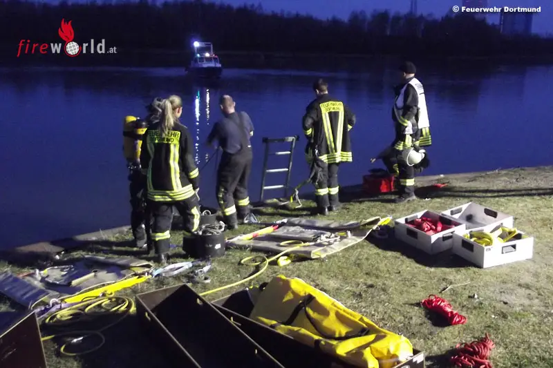 Als die Spezialeinheit-Bergung der Feuerwache Mitte an der Einsatzörtlichkeit eintraf, waren Taucher der Feuerwehr Datteln bereits dabei, den Pkw im Kanal für die Bergung vor zu bereiten. Der Einsatzleiter forderte zusätzlich die Spezialeinheit-Wasserrettung der Feuerwehr Dortmund an, da mit deren Equipment das Fahrzeug sicher an die Wasseroberfläche gebracht werden konnte.