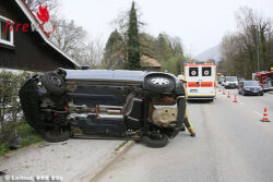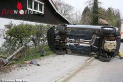 BAD REICHENHALL (BAYERN): Kurz nach 14.15 Uhr des 5. April 2016 hat sich auf der Berchtesgadener Straße ein spektakulärer Verkehrsunfall ereignet, der überraschend glimpflich ausging: Eine ältere Autofahrerin war mit ihrem VW Polo von der Straße abgekommen und in einen Gartenzaun geprallt, wobei ihr Kleinwagen umstürzte und auf der Beifahrerseite liegen blieb.