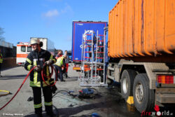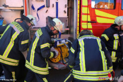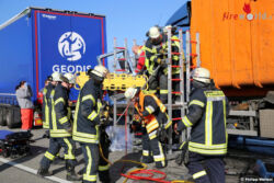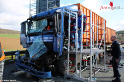 Er wurde von der Freiwilligen Feuerwehr der Gemeinde Mücke aus seinem Unfallwrack gerettet. Wie Einsatzleiter Bernd Wießner informierte, war der Verunfallte im Bereich der Beine eingeklemmt. In einer halbstündigen Rettungsaktion befreiten ihn die Feuerwehrleute der Einsatzabteilung aus Nieder-Ohmen mit hydraulischen Rettungsgeräten. „Über eine Rettungsplattform wurde das Unfallopfer schließlich mit einem Rettungsbrett aus dem Fahrerhaus gehoben“, so der Einsatzleiter.