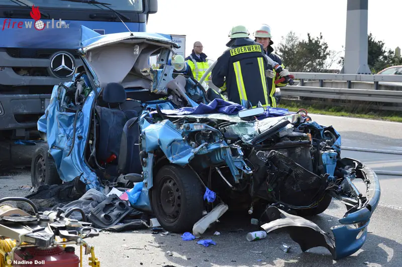 KRONAU / WALLDORF (DEUTSCHLAND): Gegen 14:40 kam es am 6. April 2016 kurz vor der Überleitung auf die A6 am Kreuz Walldorf zu einem folgenschweren Auffahrunfall bei dem ein mit drei Personen besetzter Kleinwagen zwischen zwei Lkw eingeklemmt wurde. Der Aufprall war so stark, dass sich der Kleinwagen im auffahrenden Lkw regelrecht verkeilt hatte und die Insassen eingeklemmt wurden.