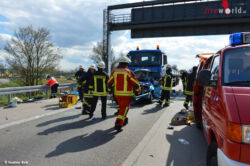 Die Feuerwehr Waghäusel war eine knappe Stunde mit der Rettung der drei eingeklemmten Personen beschäftigt. Für eine Person kam jedoch jede Hilfe zu spät. Sie verstarb noch an der Einsatzstelle. Die beiden weiteren Insassen wurden mit schwersten Verletzungen dem Rettungsdienst übergeben und anschließend mit Rettungshubschraubern zur weiteren Versorgung in umliegende Krankenhäuser geflogen. Die beiden leicht verletzen Lkw-Fahrer wurden ebenfalls vom Rettungsdienst versorgt und mit je einem Rettungswagen in Krankenhäuser verbracht. Die Feuerwehr Bruchsal unterstütze in Absprache mit dem Einsatzleiter und stellte den Brandschutz an der Einsatzstelle sicher.