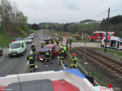 FELDKIRCHEN AN DER DONAU (OÖ): Donnerstagnachmittag, 7. April 2016, wurde die Freiwillige Feuerwehr Lacken zu einem Zugsunfall auf der Rohrbacher Straße (B127) alarmiert. Eine 45-jährige Frau aus Feldkirchen hatte einen Triebwagen übersehen und ist mit diesem zusammengestoßen. Die Lenkerin und ihr mitfahrender 10-jährige Sohn kamen mit dem Schrecken davon.