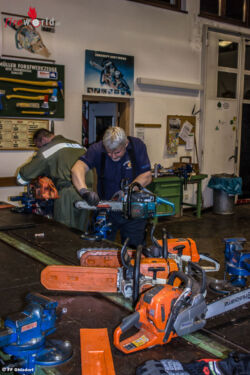 Ein sehr ausführlich behandelter Punkt war die richtige Instandsetzung und besonders das Schärfen einer Kettensäge. Neben der Verminderung des Unfallrisikos durch eine zu lockere Kette kann mit einer korrekt gefeilten Sägekette auch die Belastung auf den Körper minimiert und gleichzeitig die Leistung gesteigert werden. So konnten alle Kameraden, kurz "die Männer", die von zu Hause mitgebrachten Motorsägen, welche mitunter als "motorisierte Taschenmesser" von Franz bezeichnet wurden unter Aufsicht und anschließender Bewertung samt Kommentar feilen.