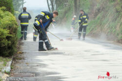 Um den Ölfilm zu bekämpfen wurde anschließend in der Weingartenspritze eines Kameraden Bioversal angerührt, das so großflächig ausgebracht werden konnte. An einen Einsatz von Löschern wäre bei dem Ausmaß der Verunreinigung nicht zu denken gewesen. Zumindest die Endreinigung der Fahrbahn ersparte sich die Feuerwehr dieses Mal: Von Seiten der Gemeinde wurde eine Kehrmaschine angefordert, die innerhalb relativ kurzer Zeit die Arbeit erledigte, mit der die Kameraden noch viele Stunden beschäftigt gewesen wären. Dennoch zog sich der Einsatz von 10:30 Uhr bis 14:30 Uhr hin.