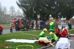 Relativ rasch konnten die Atemschutztrupps die ersten Personen in dem zu Übungszwecken verrauchten Gebäude auffinden und an den Rettungsdienst übergeben. Die weiteren eintreffenden Feuerwehren stellten ebenfalls Atemschutztrupps zur Menschenrettung, auch ein Faß mit Gefahrgut, wie sich herausstellte mit Diesel, galt es aus dem Brandgeschehen zu bergen. Die Verletztendarsteller waren zuvor, um einen realistischen Übungsablauf auch für die Kräfte des Rettungsdienstes sicherzustellen, geschminkt und im Verhalten ihrem jeweiligen Verletzungsmuster entsprechend unterwiesen worden.