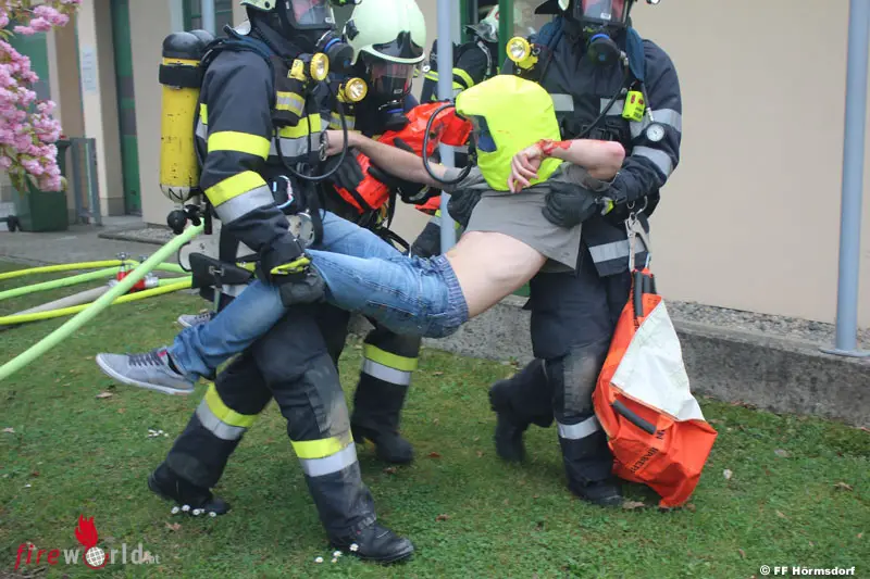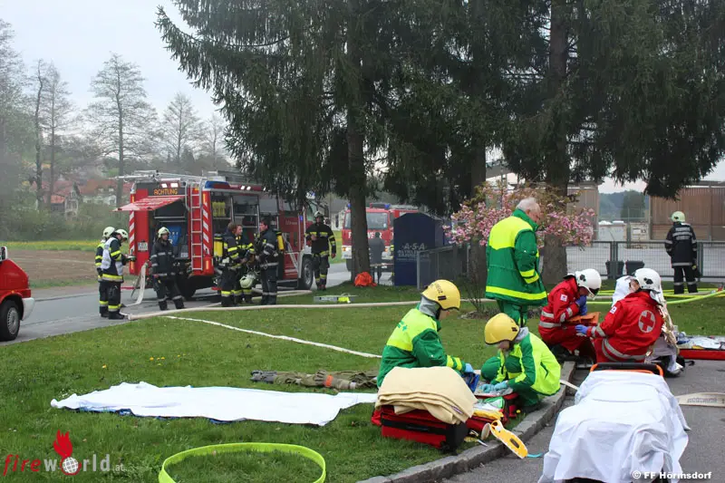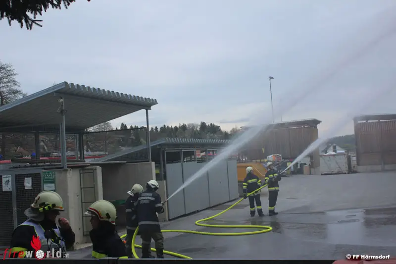Um 15.00 Uhr erfolgte die Alarmierung der übungsleitenden FF Hörmsdorf sowie, wie im Alarmplan für das entsprechende Alarmstichwort vorgesehen, der FF Eibiswald und der FF Pitschgau-Haselbach. Die eintreffenden Kräfte der ersten Fahrzeuge begannen unverzüglich die Menschenrettung unter schwerem Atemschutz aus dem verrauchten Gebäude vorzubereiten. Parallel dazu wurden Zubringleitungen von einem Hydranten sowie dem nahe gelegenen Saggaubach vorbereitet, um die Wasserversorgung sicherzustellen sowie eine Leitung zum Schutz des benachbarten Verwaltungsgebäudes vorgenommen.