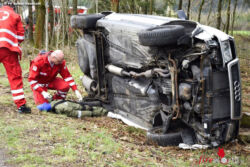 Übrigens: Leider konnten die notwendigen Abstände bei den Absperrungen rund um den Übungs-/Unfallort nicht eingehalten werden, da die Witterung dies nicht zuließ. Bei Einhaltung dieser Abstände wären Feld- und Flurschäden zustande gekommen.