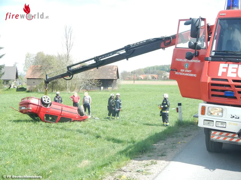 DEUTSCHLANDSBERG (STMK): Zu einer Fahrzeugbergung auf der L619, der Glashüttenstraße, wurde die Feuerwehr Deutschlandsberg in den Mittagsstunden des 10.04.2016 alarmiert. Ein Fahrzeuglenker hatte aus bisher unbekannter Ursache die Kontrolle über sein Fahrzeug verloren und stürzte über die Wegböschung und überschlug sich dort.