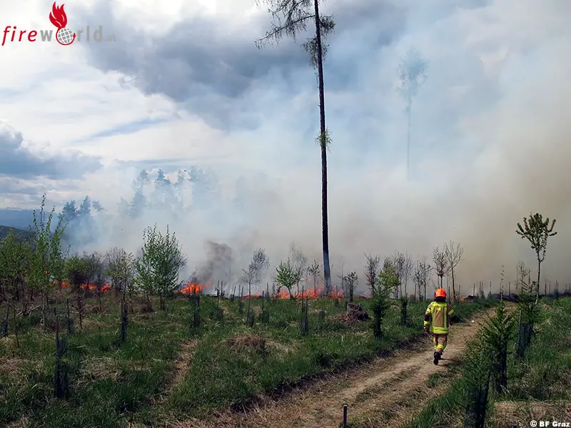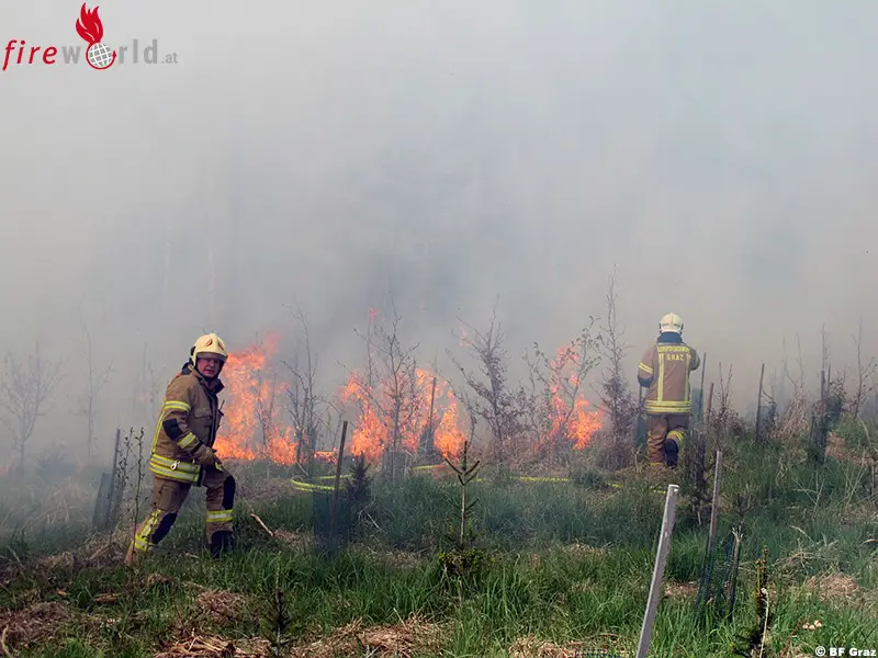 Der Brand erstreckte sich auf eine Fläche von ca. 10.000 m². Der Brand konnte von der BF Graz mit 4 C-42 Löschleitungen und Unterstützung durch einen Hubschrauber des Bundesministerium für Inneres eingedämmt werden. Der Brand konnte dadurch von allen Seiten bekämpft und eine Ausbreitung in den angrenzenden dichteren Wald verhindert werden. Die Löschwasserversorgung wurde durch einen Pendelverkehr mit zwei HLF und dem GTLF (Großtanklöschfahrzeug) sichergestellt.