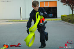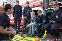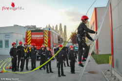 In Kleingruppen aufgeteilt erlernten die angehenden Feuerwehrmänner im Alter von 10 – 15 Jahren den Aufbau einer Löschleitung sowie das richtige Aufstellen und Besteigen einer Steckleiter. Besonders das Auswerfen der C-Schläuche stellte sich schwieriger als gedacht dar. Beim Besteigen der Leiter wurden alle Mitglieder der Feuerwehrjugend durch einen ausgebildeten Höhenretter gesichert.