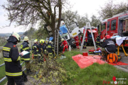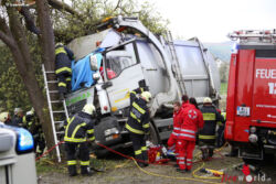 "Die Alarmierung war ein Verkehrsunfall mit eingeklemmter Person. Vorgefunden haben wir einen Lastwagen, der gegen einen Baum gefahren ist. Der Fahrer konnte selbstständig aussteigen. Die Beifahrerin war leider Gottes sehr unglücklich und stark eingeklemmt. Die Rettung der Person hat sich sehr schwierig gestaltet. Wir haben fast eine ganze Stunde versucht das Führerhaus wieder auszustrecken, sodass wir die Person befreien konnten," schildert Albin Schauer, Kommandant der Feuerwehr Scharten.