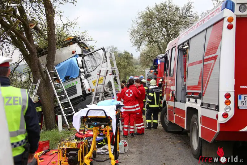 SCHARTEN (OÖ): Ein schwerer Lkw-Unfall ereignete sich Donnerstagvormittag, 14. April 2016, auf der Schartener Straße in Scharten (Bezirk Eferding). Ein Lkw krachte gegen einen Baum neben der Schartner Straße, die Beifahrerin wurde bei dem Unfall schwer im Fahrzeug eingeklemmt.