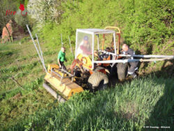 Am Einsatzort wurde der Traktor gegen weiteres Abrutschen gesichert und mittels Greifzug wieder auf die Räder gestellt. Da ein Einsatz von Erdankern wegen der Bodenbeschaffenheit nicht möglich war, musste ein Anschlagpunkt für den Greifzug bei einem Baum hergestellt werden, der ca. 40m vom Traktor entfernt in einem Wald stand. Eine große Hilfe bei dieser Traktorbergung war ein Feuerwehrkamerad mit seinem Quad. Denn das ganze Material wie Greifzug, Bandschlingen, Drahtseile usw. musste vom Aufstellort des LFB-A ca. 150m Bergauf zum Unfallort und wieder zurück transportiert werden.