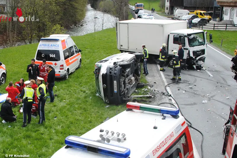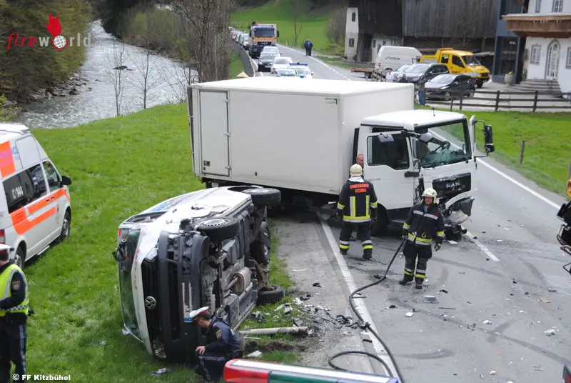 KITZBÜHEL (TIROL): Am frühen Nachmittag kam es am Freitag, den 15. April 2016, auf der B 161 zu einem folgenschweren Verkehrsunfall. Eine Fahrzeuglenkerin kam auf die Gegenfahrbahn und kollidierte mit einem Klein – Lkw. In weiterer Folge drehte sich dieser und brachte einen weiteren Kleinbus zum umstürzen.