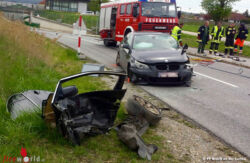 WILFLEINSDORF (NÖ): Am Freitag, den 15. April 2016, ereignete sich um die Mittagszeit auf der L2045 bei Wilfleinsdorf ein folgenschwerer Verkehrsunfall. Bei der Kollision zweier Pkw auf Höhe der Bahnunterführung wurden beide Fahrzeuge erheblich beschädigt und einer der Fahrer eingeklemmt.