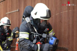 Sofort drangen zwei Trupps unter schwerem Atemschutz und unter Zuhilfenahme des hydraulischen Rettungsgerätes in den Schuppen vor um die eingeklemmte „schwer verletzte“ Person zu retten. Nach kurzer Zeit gelang es den eingesetzten Kräften die Menschenrettung erfolgreich durchzuführen und den „Patienten“ an den, im Freien auf Bereitschaft stehenden Rettungssanitäter, zu übergeben. Gleichzeitig wurden die Nachbarobjekte aufgrund der Brandausbreitungsgefahr, von außen geschützt und ein allumfassender Löschangriff gestartet. Parallel dazu wurde eine Löschwasser-Zubringerleitung vom Hydranten in der Apothekergasse gelegt. Der Rollcontainer mit 500 Meter B-Schlauch, welcher auf dem KRFA-L situiert ist, erwies sich als große Erleichterung bei der Löschwasserversorgung.