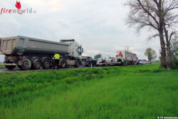 Kurz darauf rückten in kurzen Abständen das Vorausfahrzeug, das Rüstfahrzeug, zwei Tanklöschfahrzeugen und dem Abschleppfahrzeug aus. Beim Eintreffen der Feuerwehrmannschaft bot sich folgendes Bild. Von Schwadorf Richtung Schwechat kurz vor der Gasreduzierstation musste ein Lkw mit Anhänger abbremsen, weil am rechten Fahrbahnrand Mäharbeiten stattfanden. In weiterer Folge prallte ein Abschleppfahrzeug mit Anhänger, beladen mit einen Puch-G und einem Klein-Lkw auf den Lkw.