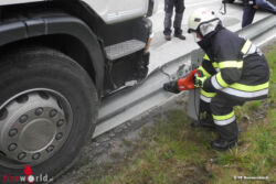 Vor Ort wurde ein auf der Leitplanke stehender Lkw vorgefunden. Nach der Beseitigung der Leitplanke mit der Säbelsäge konnte der Lastwagen wieder selbständig auf die Straße fahren.Bei diesem Unfall wurde niemand Verletzt.
