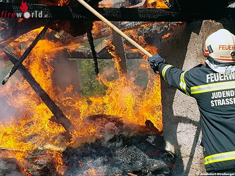 Die umliegenden Gebäude, darunter das Wohnhaus konnten mit diesen Maßnahmen vor einem Brandübergriff gerettet werden. Das Wirtschaftsgebäude wurde jedoch komplett zerstört. Mit Hilfe von einem Feuerwehreinsatzfahrzeug mit einem Greifer wurden in der Folge absturzgefährliche Bauteile vom Gebäude abgetragen und das Brandgut auseinander geteilt. „Brand aus!“ konnte um 19.12 Uhr gegeben werden.