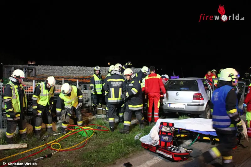 ST. VEIT / GÖLSEN (NÖ): Am 21.04.2016, um 20:43 Uhr wurde die FF Rainfeld gemeinsam mit der FF Rohrbach und FF St. Veit/Gölsen zu einem schweren Verkehrsunfall mit einer eingeklemmten Person alarmiert. Ein Pkw kam aus bisher ungeklärter Ursache auf der B 18 (auf Höhe der Firma Indat) in Richtung St. Veit / Gölsen fahrend auf der rechten Seite ins Bankett und steuerte anschließend auf der linken Straßenseite gegen das Brückengeländer der Halbachbrücke.