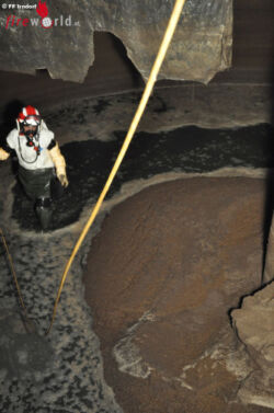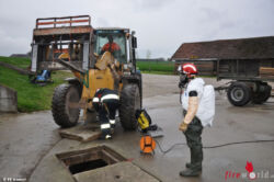 Ausgerüstet mit Watthose und Komplettgurt stieg ein Atemschutzträger – gesichert durch einen Höhenretter der Feuerwehr Irndorf – in die Grube ab und begann mit der aufwändigen Suche. Nach etwa 25 Minuten Suche wurde die Gelenkswelle gefunden und geborgen. Ein zweiter Atemschutzträger stand permanent als Sicherungstrupp zur Verfügung. Ein Gasmessgerät kam auch hier wieder zum Einsatz. Anzumerken ist das auch in dieser Grube H2S und der Ex. Sensor Gas detektierte.