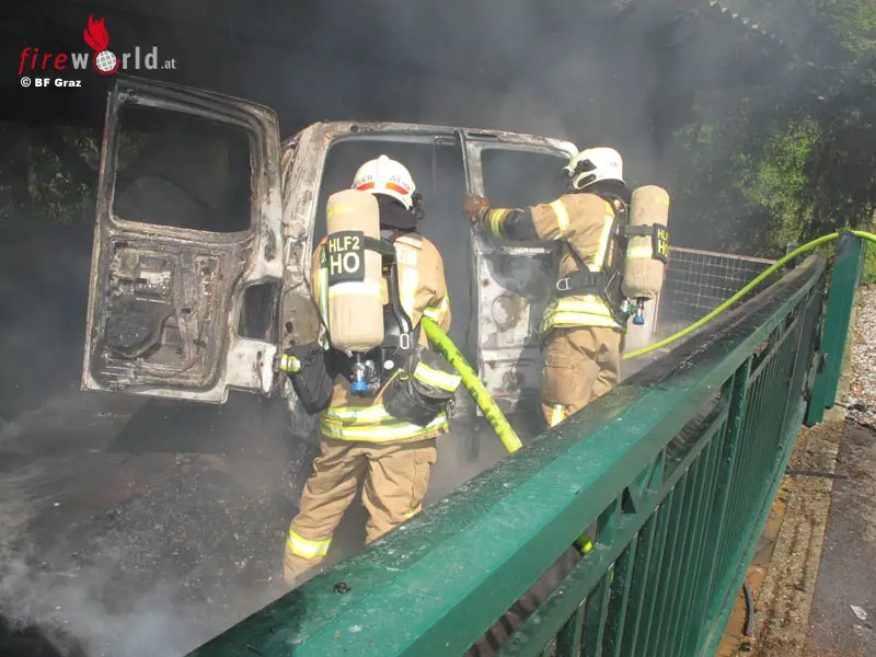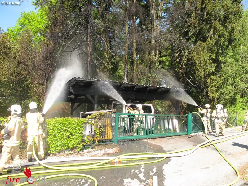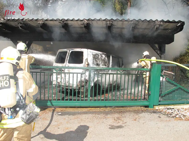 GRAZ (STMK): Die Grazer Berufsfeuerwehr wurde um 10.24 Uhr des 22. April 2016 von mehreren Notrufern zu einem Waldbrand in die Neue Welt Höhe (Bezirk St. Peter) alarmiert. Vor Ort stellte sich heraus, dass in einem Carport ein abgestellter Kastenwagen in Brand geraten ist.