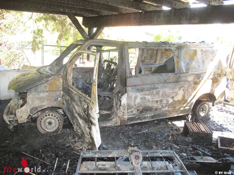 Stmk: Brennendes Carport und Transporterbrand erfassten Bäume in Graz