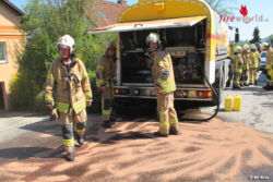 Kurz nach dem Einrücken der Kräfte folgte um 14.30 ein weiterer „brisanter“ Alarm: Treibstoffaustritt groß – Tankwagen“. In Thal bei Graz wurde die Berufsfeuerwehr mit dem Schadstoffzug von der Landesleitstelle zur Unterstützung der Freiwillige Feuerwehr Steinberg Rohrbach alarmiert. Nach einer vermutlich defekten Pumpe, trat beim Füllvorgang eines Heizöltanks ca. 800 Liter Heizöl aus. Nach dem Eintreffen der Einsatzkräfte galt es vordringlich, eine weitere Ausbreitung in eine angrenzende Wiese und einen Bach zu verhindern. Dies konnte durch das rasche Eingreifen und der guten Zusammenarbeit der Einsatzkräfte abgewehrt und so eine Umweltgefährdung verhindert werden. Die Berufsfeuerwehr stand bei diesem Alarm mit fünf Fahrzeugen und 20 Mann im Einsatz.