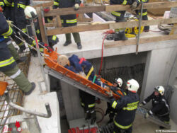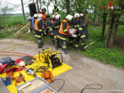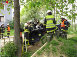 Bei der letzten Übung des Nachmittags musste ein Verletzter Bauarbeiter aus ca. 3m Tiefe gerettet werden. Der Bauarbeiter fiel beim Sturz auf einen Stahlträger und wurde von diesem aufgespießt. Vor der Rettung musste das Metallteil mittels Hydraulischen Rettungsgerät gekürzt werden. Der Verletzte wurde danach mittels Spineboard und Schleifkorbtrage über die Leiter gerettet.