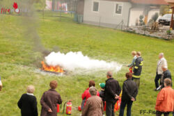Es wurden die verschiedenen Löschtechniken mit unterschiedlichen Löschmitteln geübt. Die anwesenden Senioren hatten so die einmalige Möglichkeit die Vor- und Nachteile der verschiedenen Löschmittel hautnah zu erleben, und auch selbst mit einem Pulverlöscher einen Brand zu bekämpfen. Da sehr häufig der Fehler gemacht wird, einen Fettbrand mit Wasser zu löschen, wurde den Senioren dazu ein Versuch vorgeführt, der ihnen die fatalen Folgen aufzeigte.