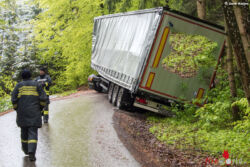 Seitens der Feuerwehr konnte der Lkw schließlich mit Einsatz von zwei Seilwinden wieder auf die Fahrbahn gezogen werden.