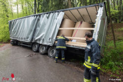 Ein Sattelzug war mit 25 Tonnen Papierrollen unterwegs nach Grünburg. Im Bereich einer engen Kurve gereit das Schwerfahrzeug zu weit nach innen, bis es kein vor und zurück mehr gab. Der Lkw saß schlussendlich auf.