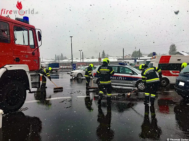 Durch die Kollision der beiden Fahrzeuge wurde dabei ein parkendes Auto und ein Moped beschädigt so Einsatzleiter Oberbrandinspektor Arnold Schlick. Nach dem Aufbau des doppelten Brandschutzes musste von den 18 eingesetzten Mann der Feuerwehr Knittelfeld die ausgetretenen Betriebsmittel gebunden und die Trümmerteile entfernt werden so Schlick weiter.