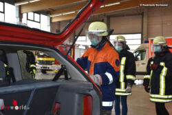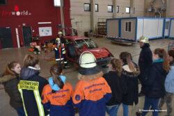 In praktischen Einheiten hatte hier die Mädchen die Möglichkeit selbst Hand anzulegen und u. a. das Löschen eines Brandes mit einem Feuerlöscher, das Zerschneiden eines PKW mit hydraulischem Rettungsgerät sowie die Durchführung einer Herz-Lungen-Wiederbelebung unter Anleitung eines Ausbilders der Rettungsdienstschule an einer Übungspuppe. Neben den männlichen Brandschützern standen ebenso zwei Feuerwehrfrauen parat, um brennende Fragen der Schülerinnen von Frau zu Frau zu beantworten.