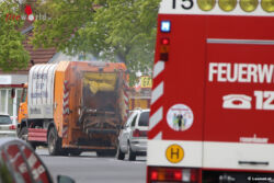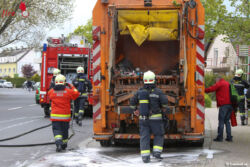 WELS (OÖ): Die Feuerwehr stand Donnerstagnachmittag, 28. April 2016, bei einem Brand eines Müllwagens in Wels-Lichtenegg im Einsatz. Die Ladung des Müllfahrzeuges hatte aus bislang unbekannter Ursache zu brennen begonnen.