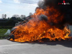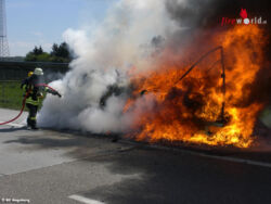 AUGSBURG (BAYERN): Gegen 13:30 Uhr des 30. April 2016 gingen mehrere Notrufe aufgrund eines brennenden Lkw auf der A8 in der Integrierten Leitstelle ein. Ein Kleintransporter war, vermutlich aufgrund eines technischen Defekts, auf Höhe der Ausfahrt Friedberg in Brand geraten.