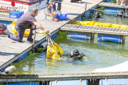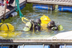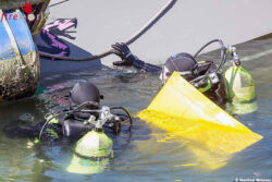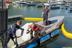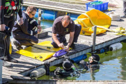 Nach der Erkundung durch den Taucheinsatzleiter rüsteten sich mehrere Feuerwehrtaucher aus und stiegen ins Wasser. Nach einer Begutachtung der vorgefundenen Situation auch unter Wasser, wurde entschieden das Boot mittel Hebeballon zu bergen.