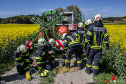 Daraufhin ließ sich die Hydraulik vom Traktor nicht mehr absenken. Da zum Zeitpunkt der Alarmierung rund zehn Kameraden gerade im Gerätehaus waren, wurde unverzüglich ausgerückt. Am Einsatzort wurde mit Hebekissen und Unterbauhölzern der Tank untergebaut und gesichert. Danach wurde dieser Zentimeter für Zentimeter angehoben, um die Hydraulik die einseitig belastet war zu entlasten. Nach kurzer Zeit gelang dies und die Spritze wurde wieder am Traktor befestigt. Der Tank wurde bei diesem kleinen Unfall nicht beschädigt. Auch der Sachschaden an der Spritze ist sehr gering.