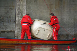 Direkt unter der schwarzen Brücke befand sich in drei Meter tiefen Wasser eine alte Badewanne aus Polyester. Mit einer Holzzille, mit Leinen vom Ufer gesichert, konnten zwei Kameraden zur Brücke gelangen. Mit 2 Wurfankern wurde die Badewanne geborgen, ans Ufer gebracht und richtig entsorgt.