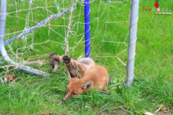 Nö: Kleiner Fuchs verheddert sich in Fußballtor
