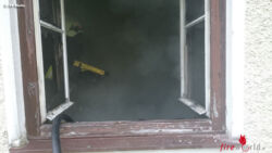 Weil die Eingangstür ins Schloss gefallen bzw. von der Bewohnerin zugezogen oder versperrt wurde, bahnte sich der erste Atemschutztrupp seinen Weg durch ein Fenster ins Gebäude und erkundete mittels Wärmebildkamera die Lage. Das gesamte Gebäude war über zwei Stockwerke massiv verraucht. Es wurden mehrere Brandstellen mittels Hochdruck-Strahlrohr und IFex-Löschgerät abgelöscht. Zusätzlich wurde sofort mit einer intensiven Beflüftung des Gebäudes durch die geöffnete Haustür begonnen.