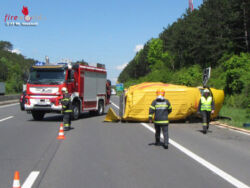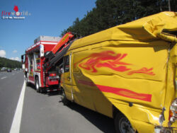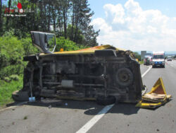 WIENER NEUSTADT (NÖ): Zu einem Verkehrsunfall auf der Südautobahn in Fahrtrichtung Wien kurz vor der Abfahrt Wöllersdorf wurde die Feuerwehr Wiener Neustadt kurz nach Mittag am 6. Mai 2016 gerufen. Der Fahrer eines Klein-Lkws verlor aus noch ungeklärter Ursache die Herrschaft über sein Fahrzeug, kreuzte die Autobahn von der dritten Fahrspur kommend im spitzen Winkel und geriet auf die Böschung. Die Wucht des Aufpralls drehte das Fahrzeug und es kam auf der Seite zum Liegen.