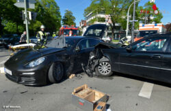 MÜNCHEN (BAYERN): Im Kreuzungsbereich des Herkomerplatz ist es am Nachmittag des 7. Mai 2016 in München zum Zusammenstoß eines Porsche Panamera und einer Mercedes E-Klasse gekommen. Der Porsche befand sich auf der Bülowstraße stadteinwärts. Der Mercedes war dann aus ungeklärter Ursache auf Höhe der Ampelkreuzung in die Fahrerseite des Porsche gefahren.